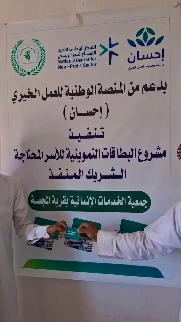 بدعم سخي من #منصة_إحسان للعمل الخيري #جمعية_الخدمات_الانسانية بقرية_المجصة تنفذ مشروع بطاقات تموينية للأسر المحتاجة بمبلغ إجمالي ( 131000) ريال لعدد 131أسرة