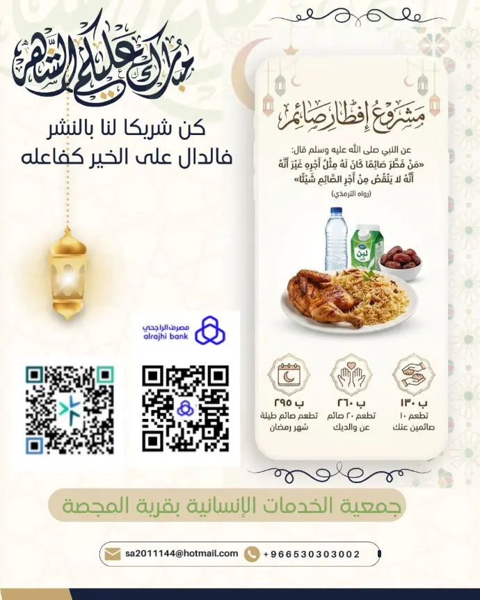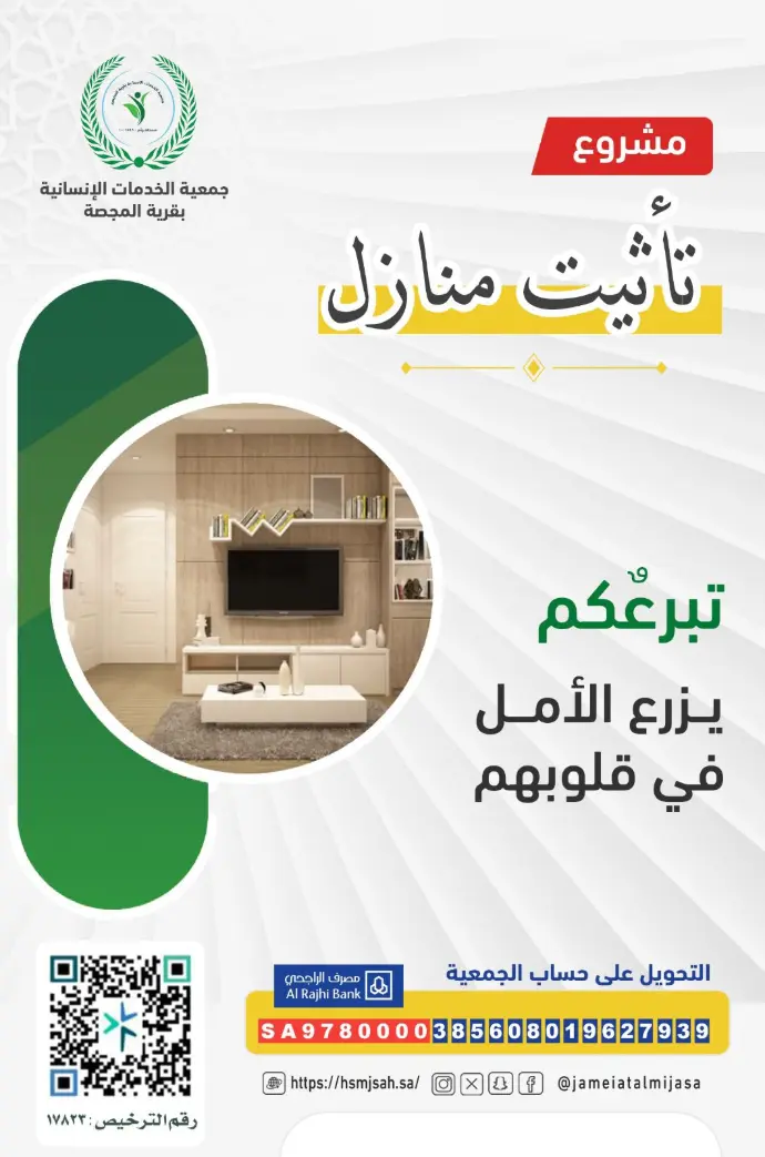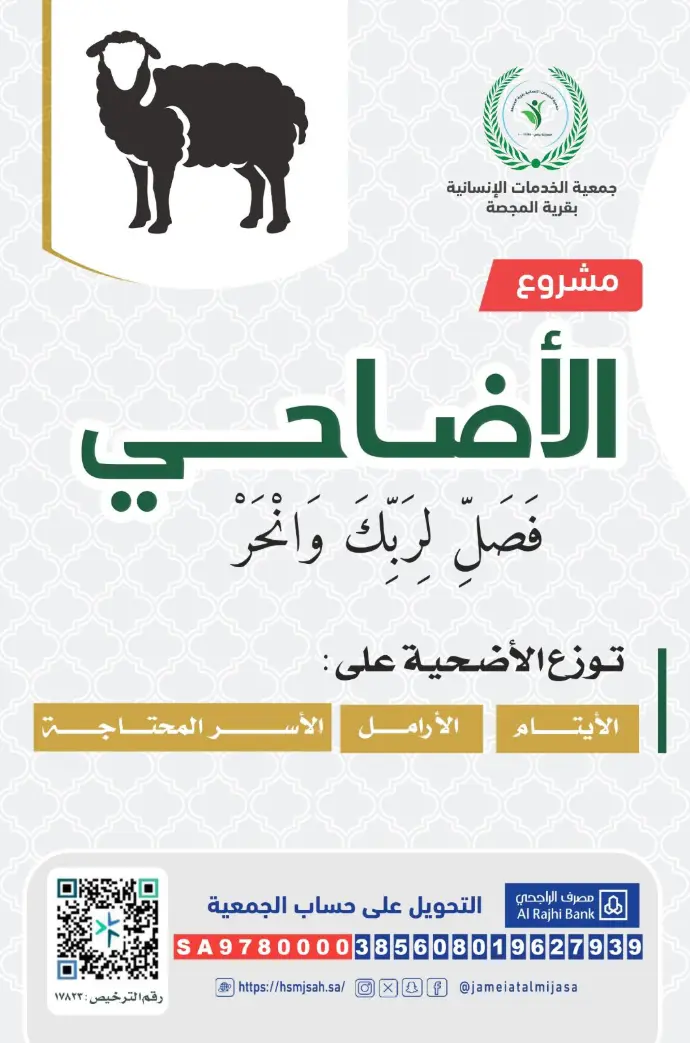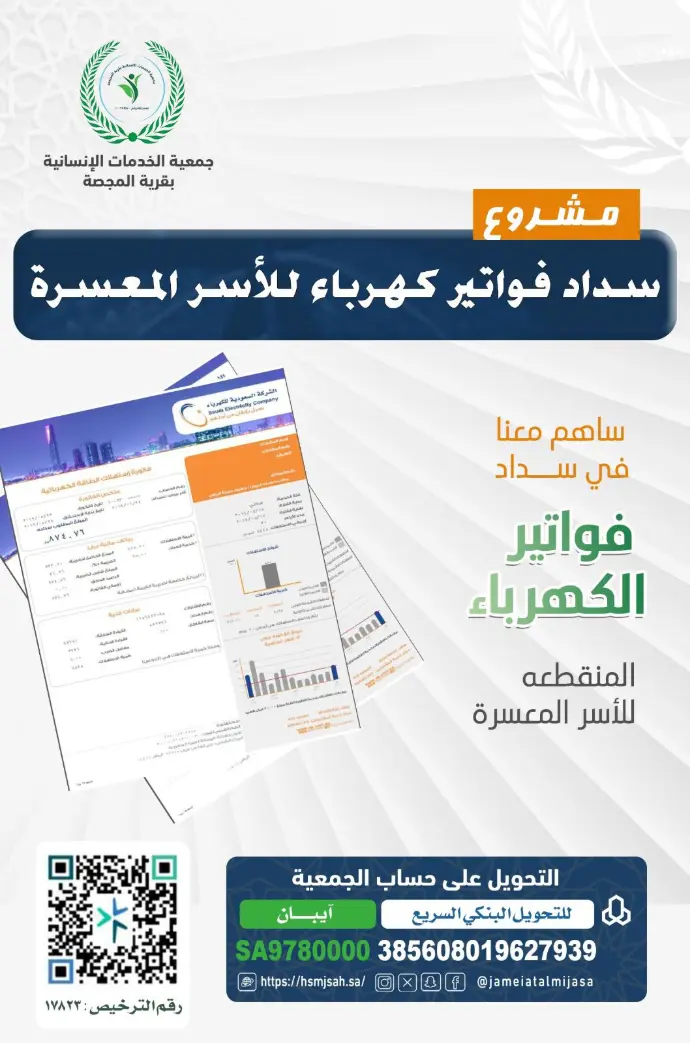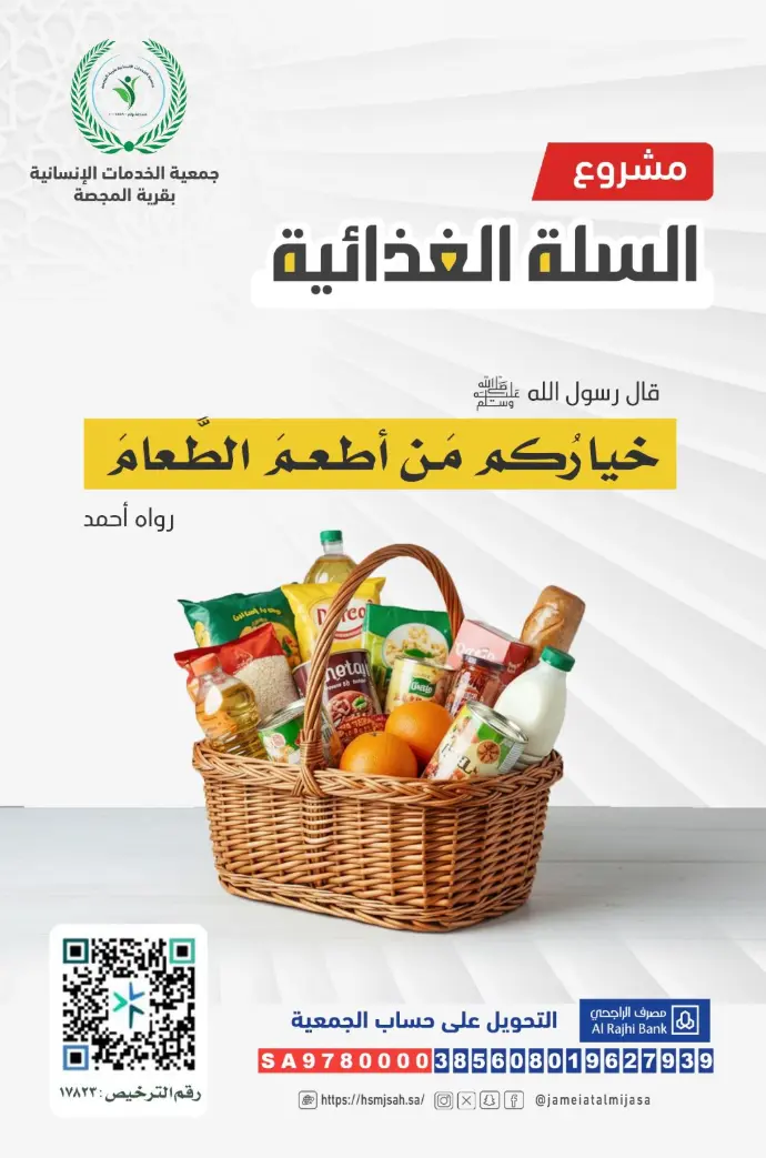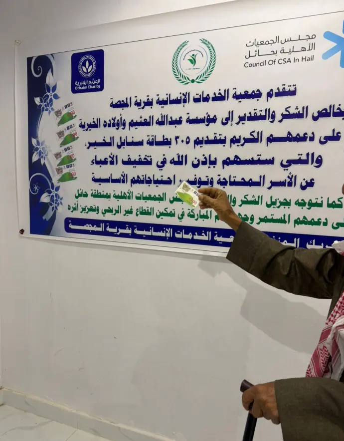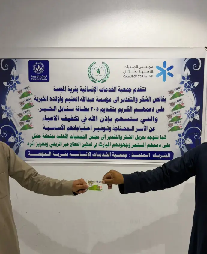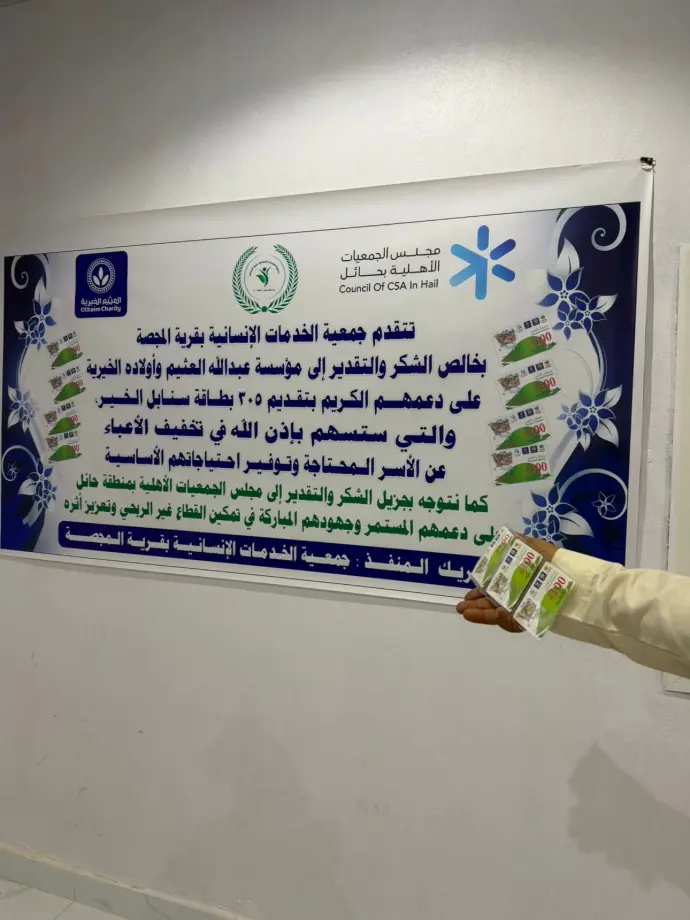 تتقدم جمعية الخدمات الإنسانية بقرية المجصة بخالص الشكر والتقدير إلى مؤسسة عبدالله العثيم وأولاده الخيرية على دعمهم الكريم بتقديم 305 بطاقة سنابل الخير، والتي ستسهم بإذن الله في تخفيف الأعباء عن الأسر المحتاجة وتوفير احتياجاتهم الأساسية.